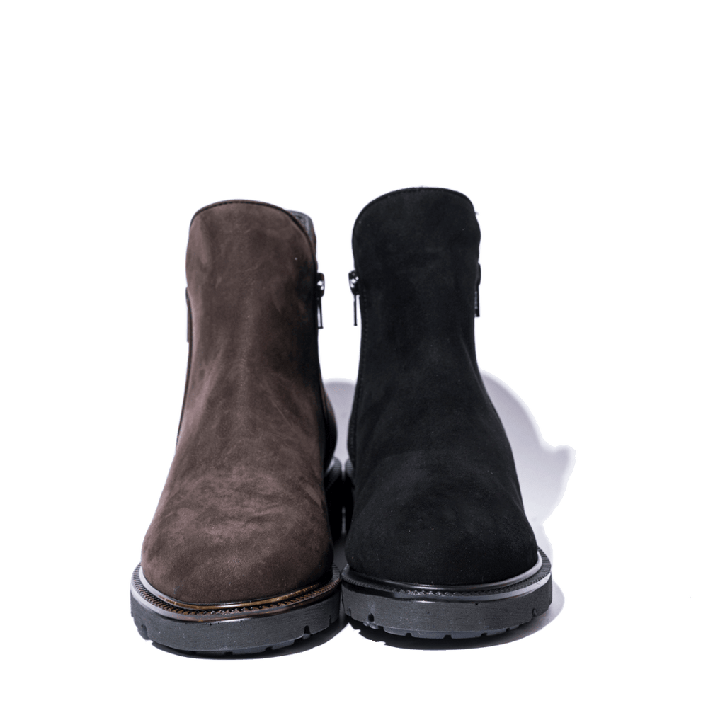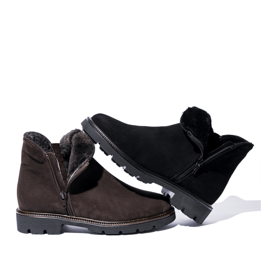 Stivaletti molto comodi lavorati artigianalmente in Italia. Tomaia in pelle morbida nabuck nera, con due cerniere laterali. Interno foderato in morbido montone. Soletta in pelle con fodera in montone, leggermente imbottita; fondo in gomma.