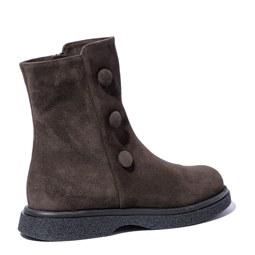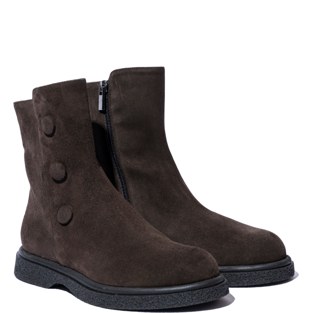 Stivaletti , dalla forma sinuosa, aderenti alla caviglia, con tomaia in pelle scamosciata marrone e bottoncini decorativi. Realizzati artigianalmente dallo storico calzaturificio veneto. Cerniera sul lato interno. Foderati in pelle, con soletta in pelle leggermente imbottita. Fondo in gomma leggera e flessibile, con tacco di 2 cm.