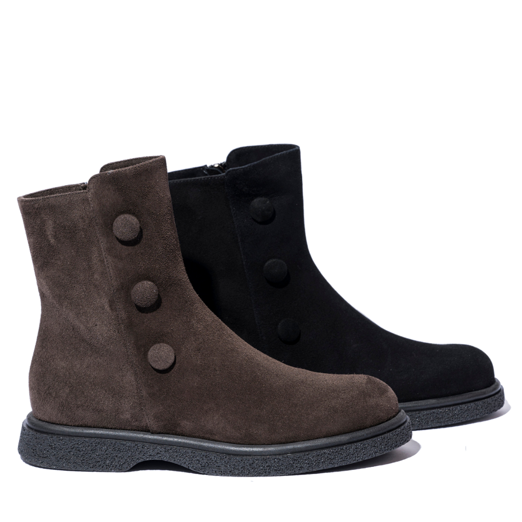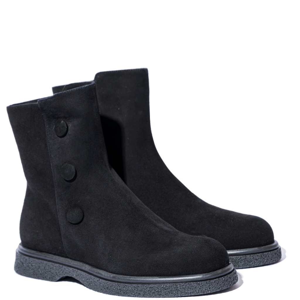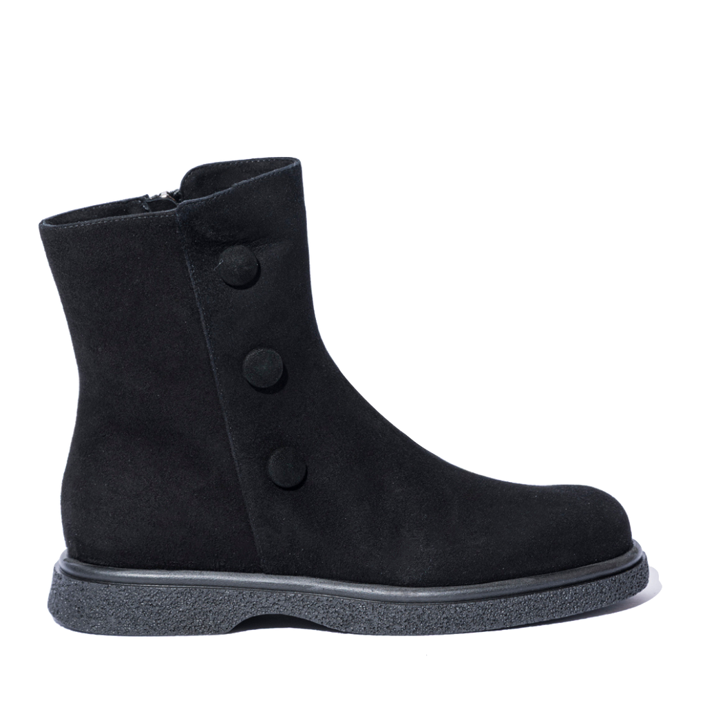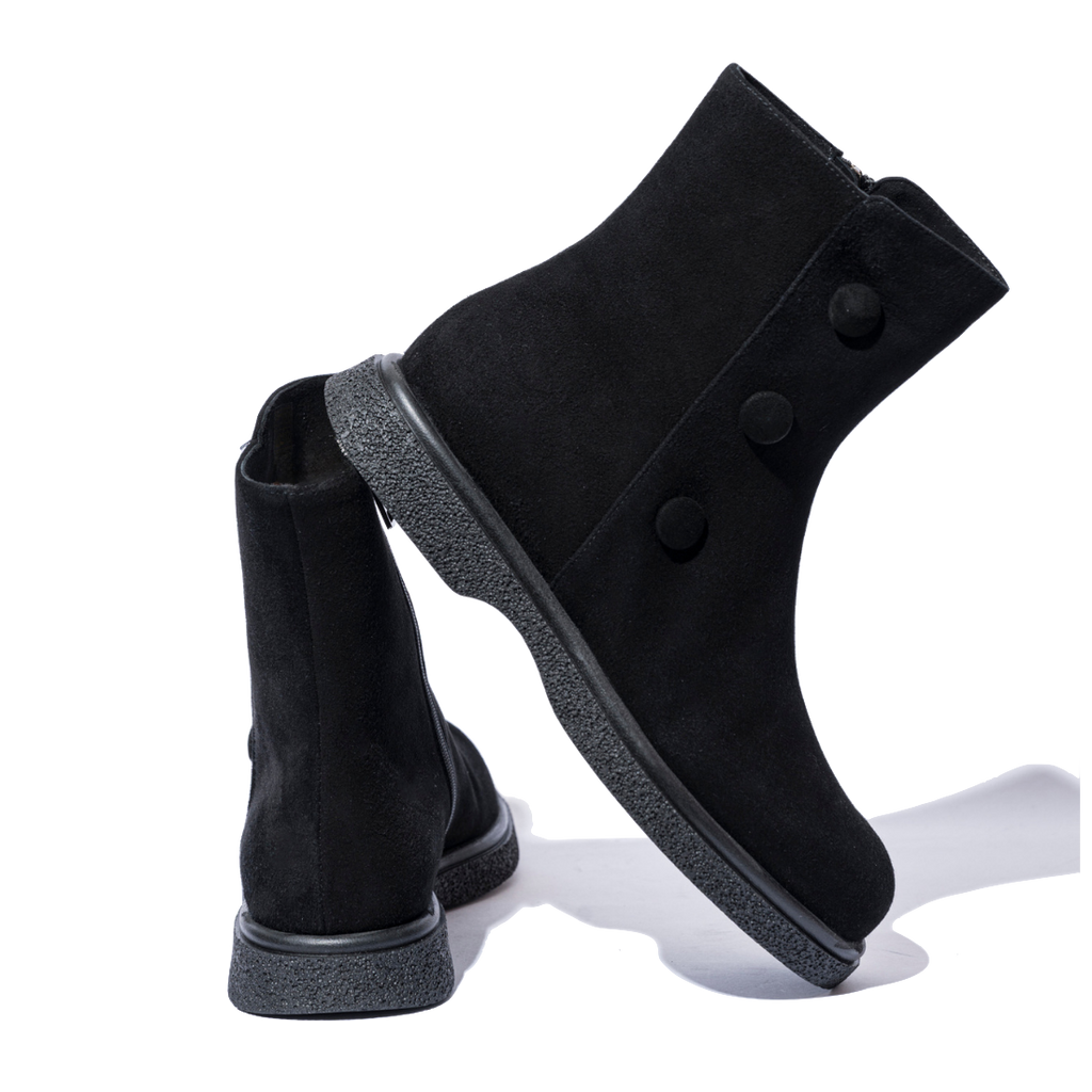 Stivaletti , dalla forma sinuosa, aderenti alla caviglia, con tomaia in pelle scamosciata nera e bottoncini decorativi. Realizzati artigianalmente dallo storico calzaturificio veneto. Cerniera sul lato interno. Foderati in pelle, con soletta in pelle leggermente imbottita. Fondo in gomma leggera e flessibile, con tacco di 2 cm.