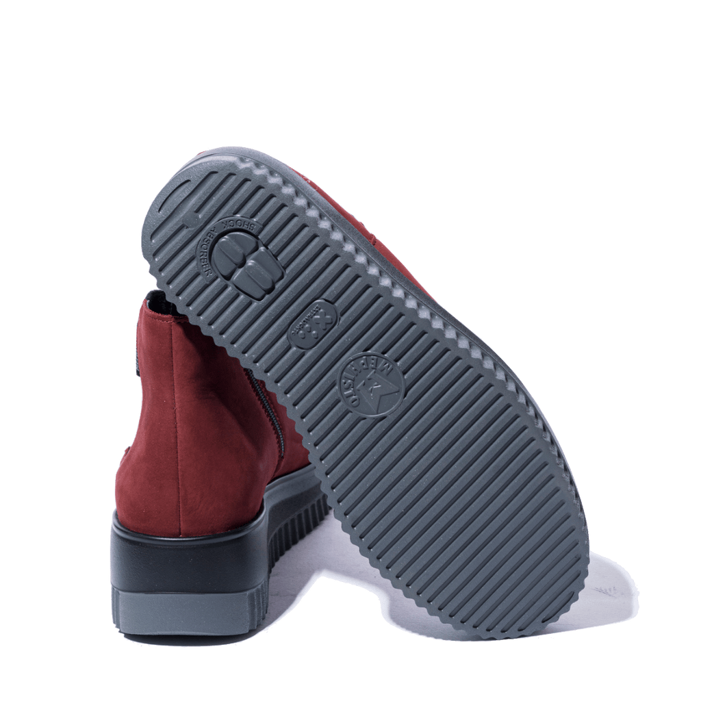 Stivaletti del marchio Mephisto, noto per il comfort unico delle sue calzature, i materiali di alta qualità, e la garanzia di camminate defaticanti. Tomaia in pelle nabuck bordeaux, con calda fodera interna e rifiniture in morbida pelle attorno alla caviglia. Banda elasticizzata laterale esterna e cerniera sul lato interno che facilita l'ingresso del piede. Il plantare, estraibile, con tecnologia Soft-Air, soffice e flessibile, ammortizza gli urti, per una sensazione di comfort durante la camminata. Fondo in leggera gomma a zeppa di altezza 4 cm