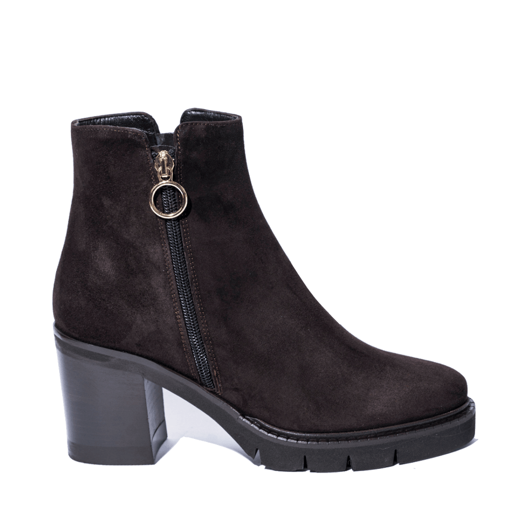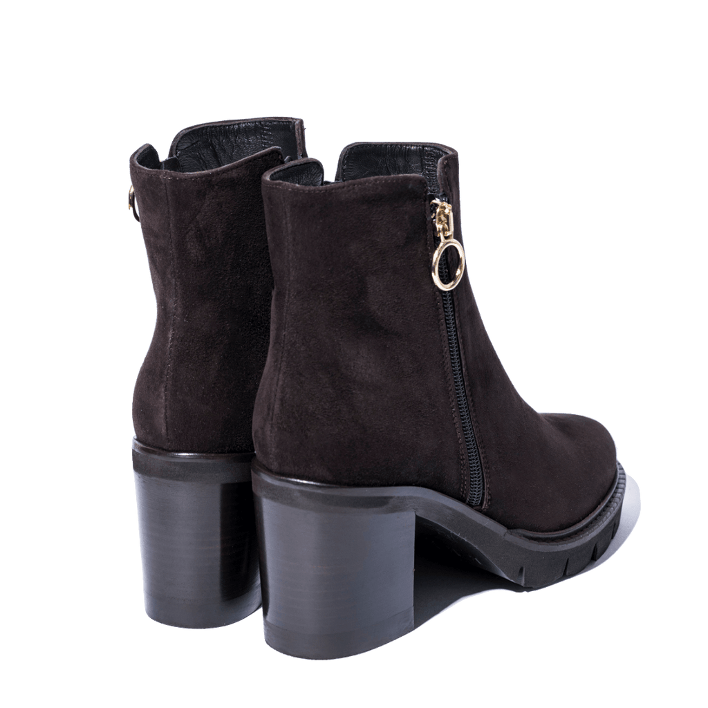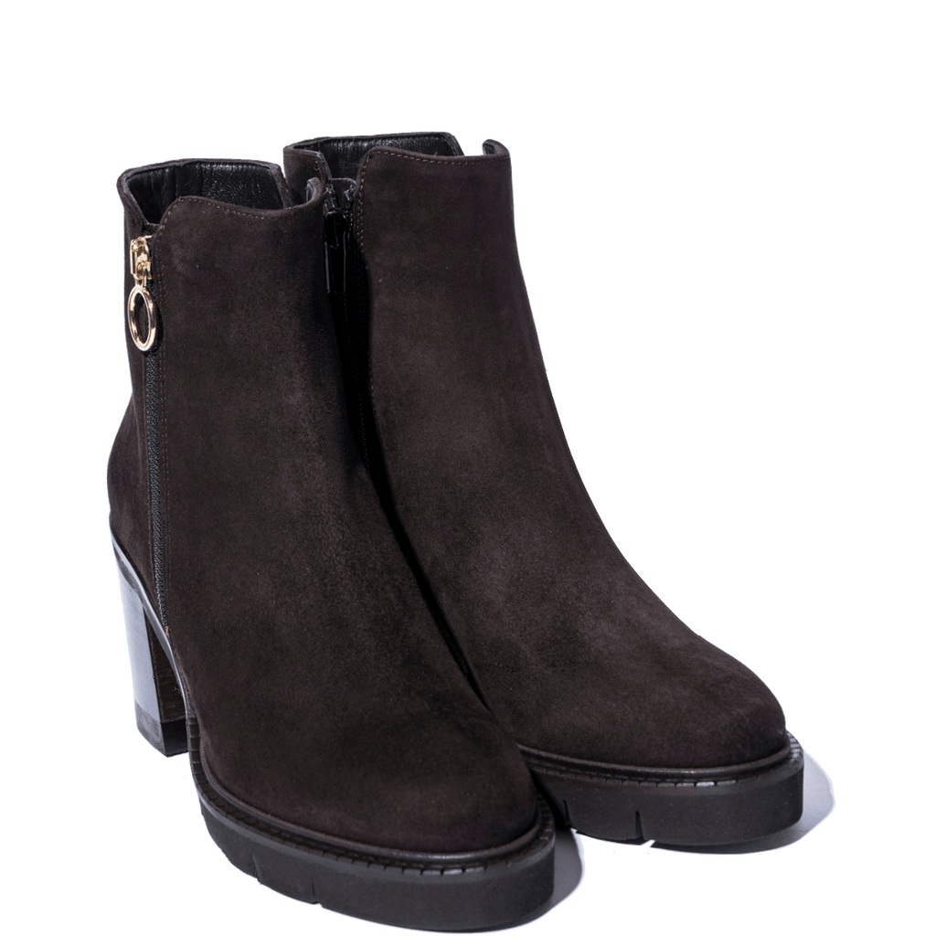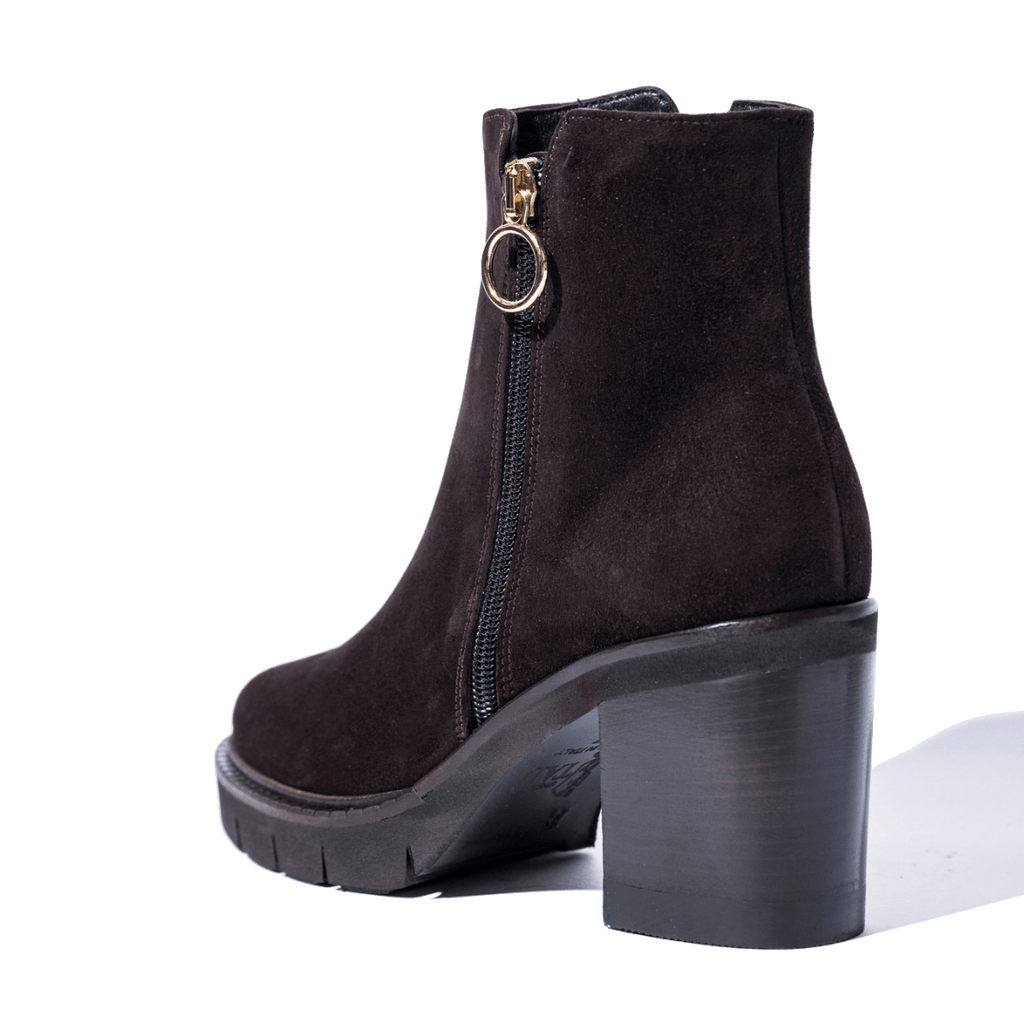 Tronchetti comodi, dalla forma leggermente affusolata, Luca Grossi: calzaturificio italiano che opera con i materiali più pregiati, provenienti dal distretto conciario della Toscana. Tomaia avvolgente alla caviglia, in pelle scamosciata marrone, con doppia cerniera, sul lato interno ed esterno. Foderati internamente in pelle. Fondo spesso in gomma millerighe, con tacco quadrato alto 6 cm