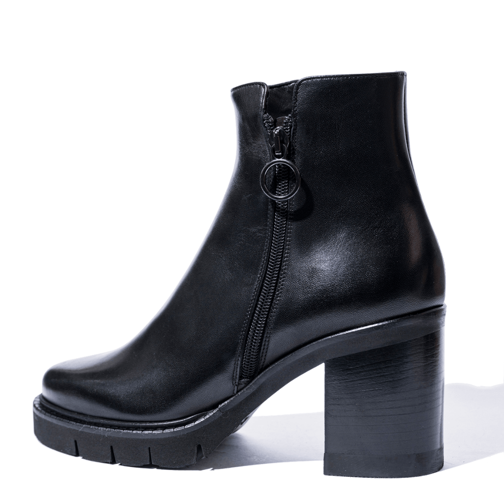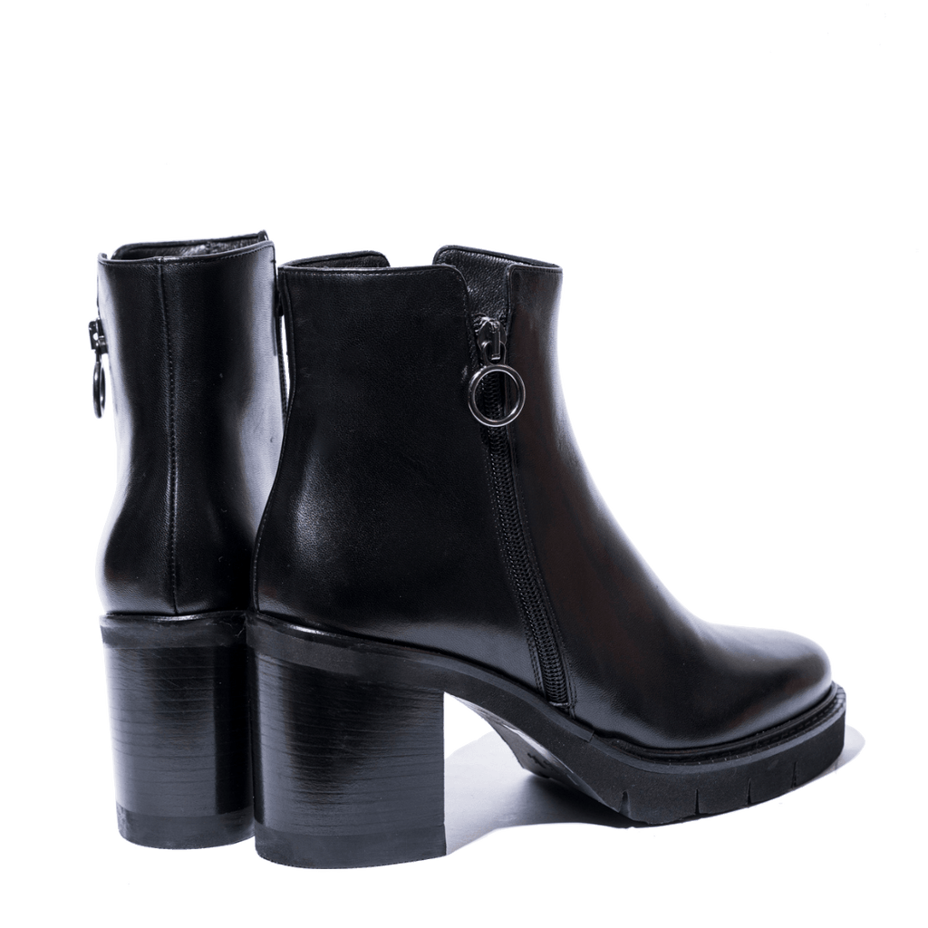 Tronchetti comodi, dalla forma leggermente affusolata, Luca Grossi: calzaturificio italiano che opera con i materiali più pregiati, provenienti dal distretto conciario della Toscana. Tomaia avvolgente alla caviglia, in pelle morbida nera, con doppia cerniera, sul lato interno ed esterno. Foderati internamente in pelle. Fondo spesso in gomma millerighe, con tacco quadrato alto 6 cm
