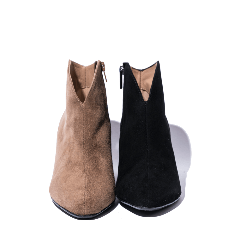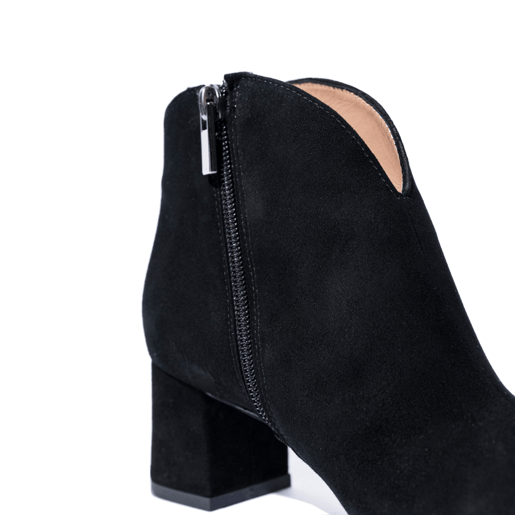 Tronchetti, dalla forma sinuosa, con scollatura profonda sul collo del piede. Tomaia in pelle scamosciata nera. Realizzati artigianalmente dallo storico calzaturificio veneto. Cerniera sul lato interno. Foderati in pelle, con soletta in pelle leggermente imbottita. Fondo in gomma leggerissima, con tacco quadrato di 5 cm.