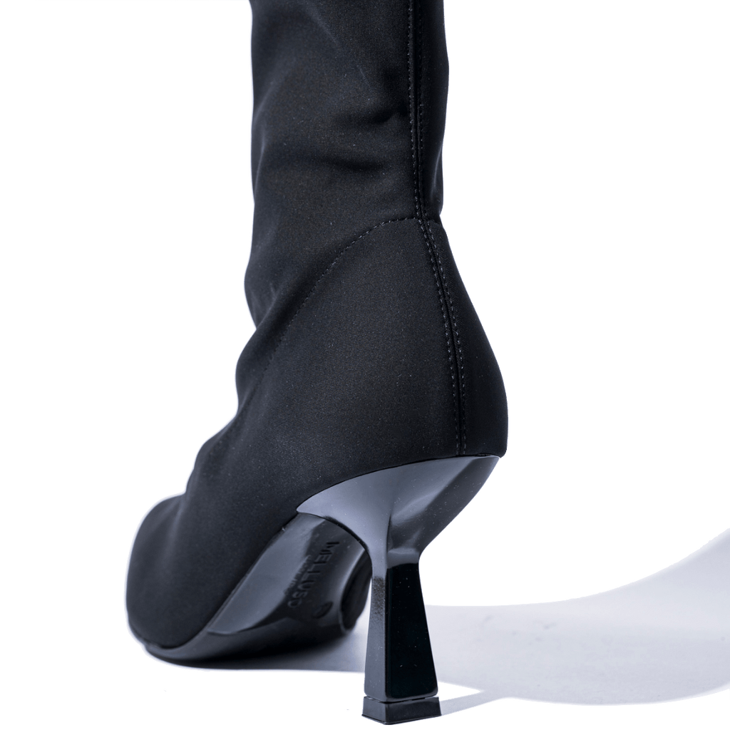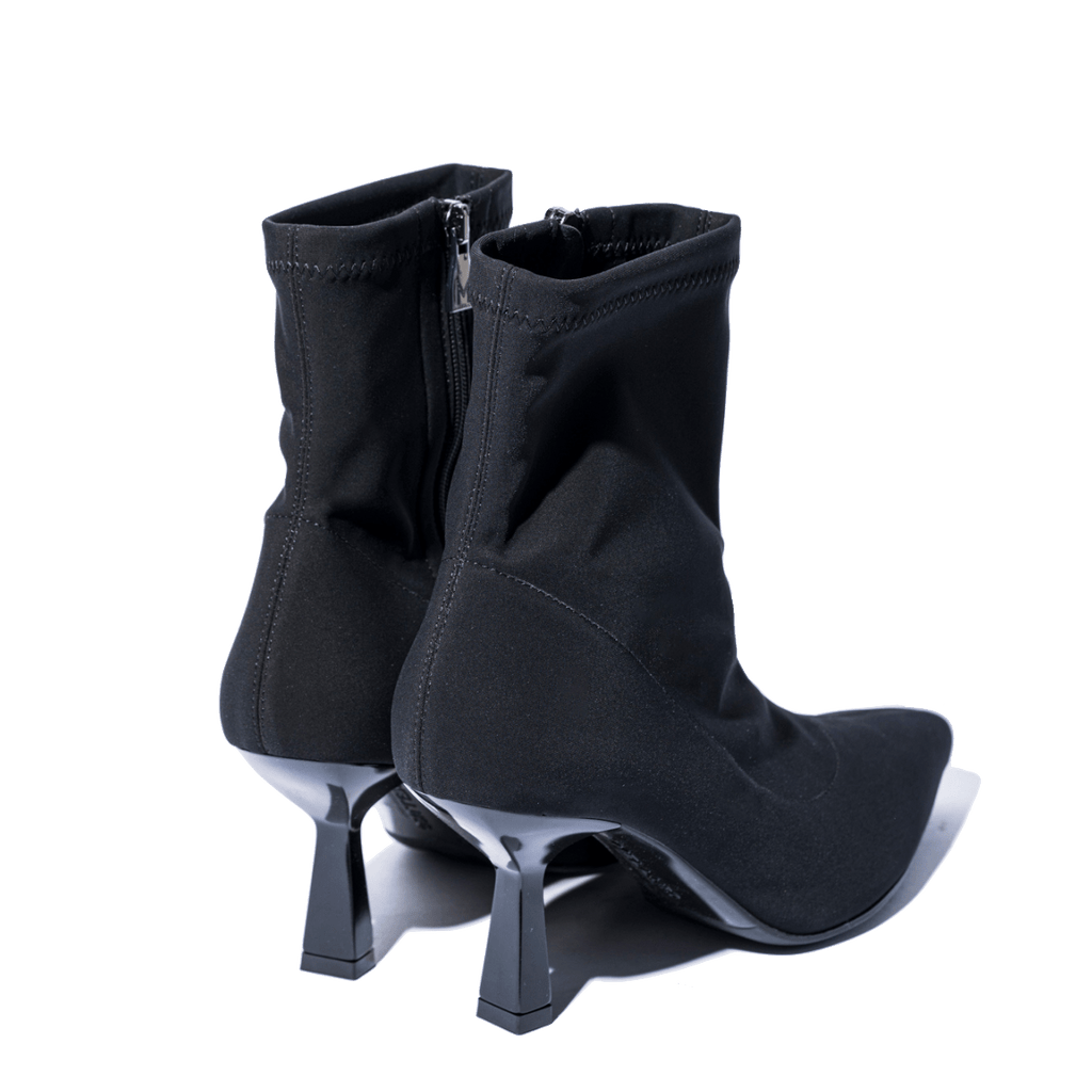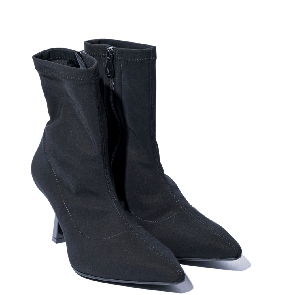 Tronchetti dalla forma affusolata, realizzati in Italia, dallo storico calzaturificio napoletano Melluso. Tomaia in tessuto traspirante, elasticizzato nero. Fondo in gomma sottile con tacco a rocchetto, che da stabilità, di altezza 8 cm; soletta in memory foam che offre una comoda calzata