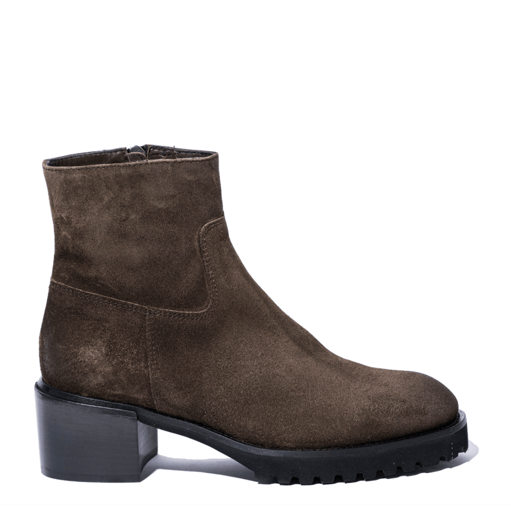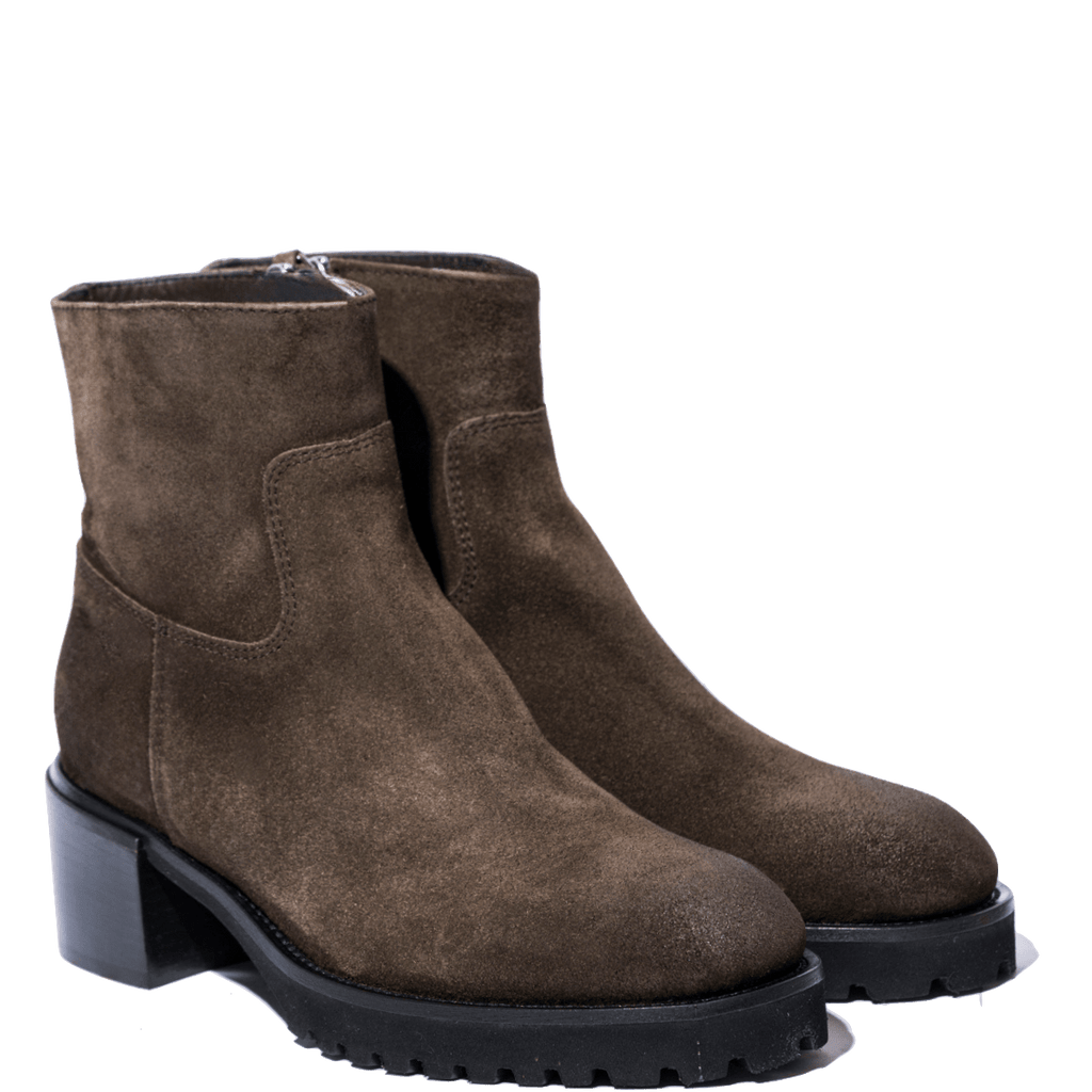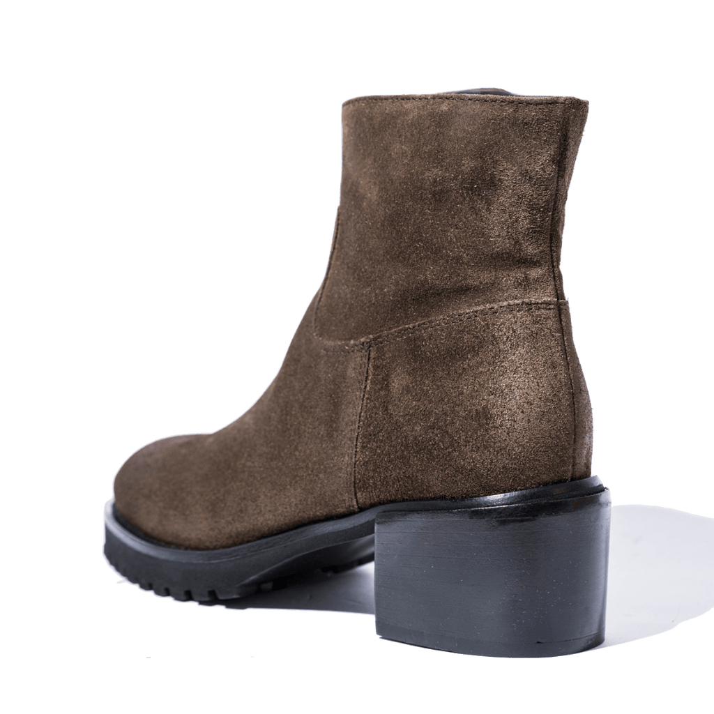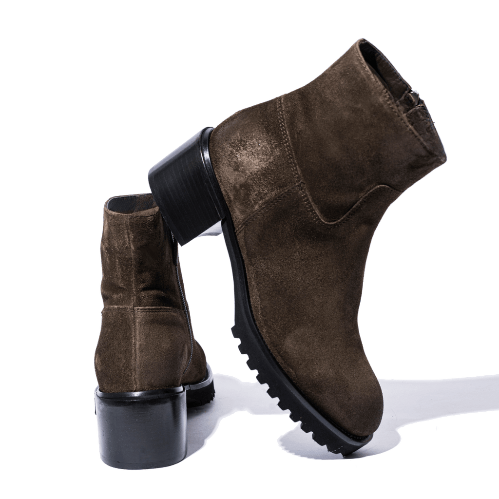 Tronchetti molto comodi, di origine marchigiana. In pelle scamosciata, leggermente ingrassata, color oliva scuro, con tacco grosso di altezza 5 cm. Interno foderato in pelle; cerniera sul lato interno, che facilita l'ingresso del piede. Fondo in gomma "carro armato; plantare in pelle leggermente imbottito. Realizzati con l'impiego di pellami e materiali pregiati.